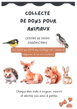 Par Secrétaire Val Cérou, publié le vendredi 10 octobre 2025 11:34 - Mis à jour le vendredi 10 octobre 2025 12:00ENDEMIC'AMIS est une association locale qui préserve et réhabilite la faune locale dans son environnement naturel, en lui prodiguant des soins médicaux. Vous pouvez aider en faisant un don matériel directement au collège (voir pièce jointe). -